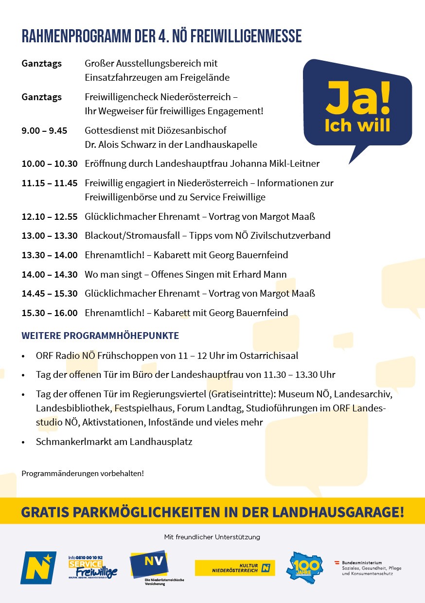 Am Sonntag, den 13. November 2022 findet im Landhaus St. Pölten die 4. Niederösterreichische Freiwilligenmesse statt. Rund 60 Organisationen suchen neue Freiwillige. Das Sozialministerium ist auf Ebene 3, Stand 32, wieder vertreten. Bei einem Wissensrad können attraktive Anerkennungspreise erworben werden. Weiters kann kostenfrei der Österreichische Freiwilligenkalender 2023 bezogen werden. Wir freuen uns auf ihren Besuch.