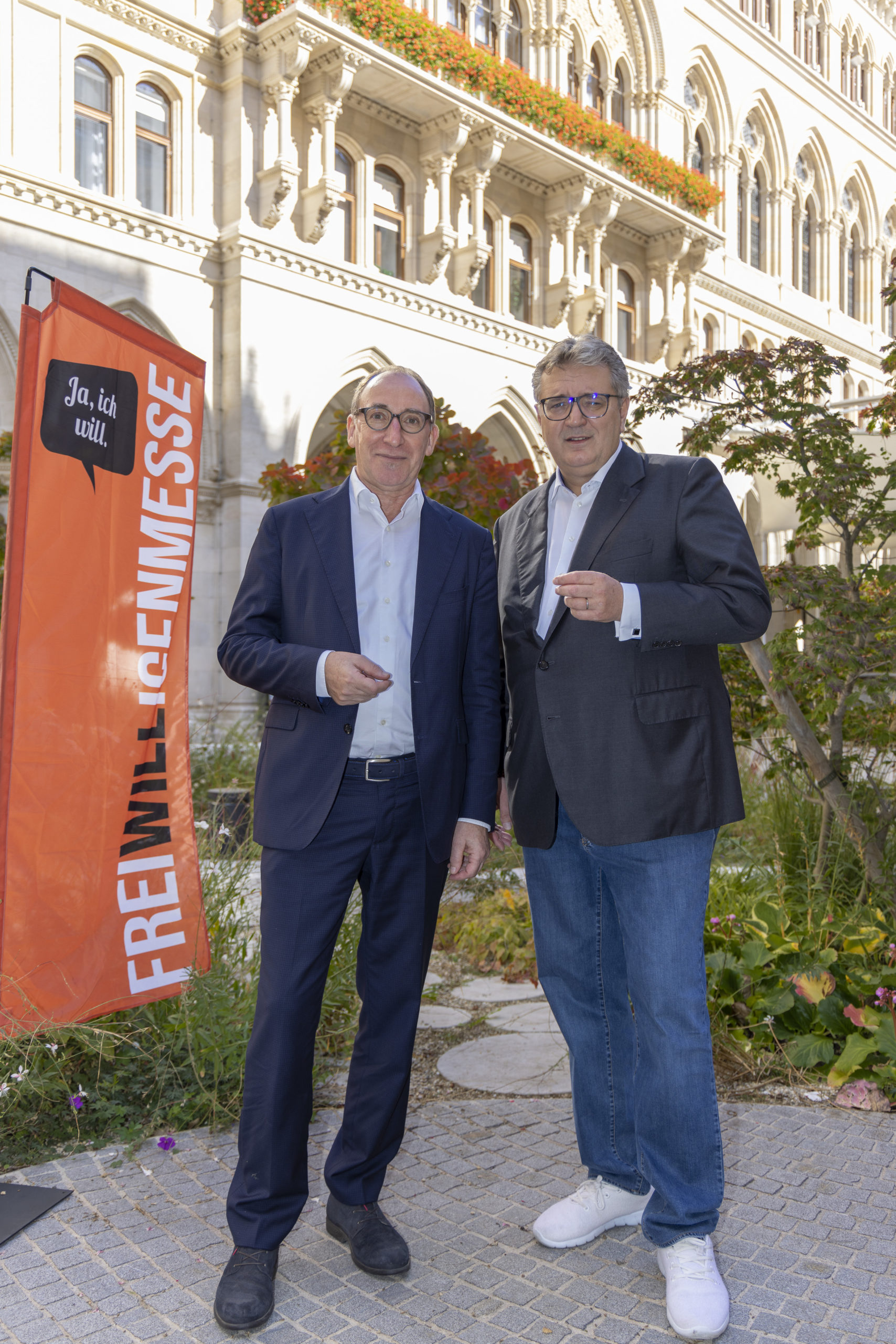 Bundesminister Johannes Rauch und Stadtrat Peter Hacker haben heute im Arkadenhof des Wiener Rathauses auf die am kommenden Wochenende stattfindende 10. Wiener Freiwilligenmesse im Wiener Rathaus aufmerksam gemacht.